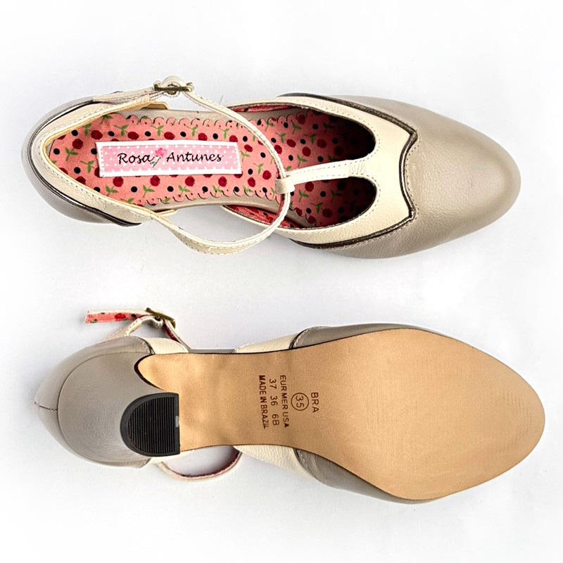 Sandália retrô em couro com salto médio de altura 8,5cm. Feito à mão. Solado em PU Idel para dançar.