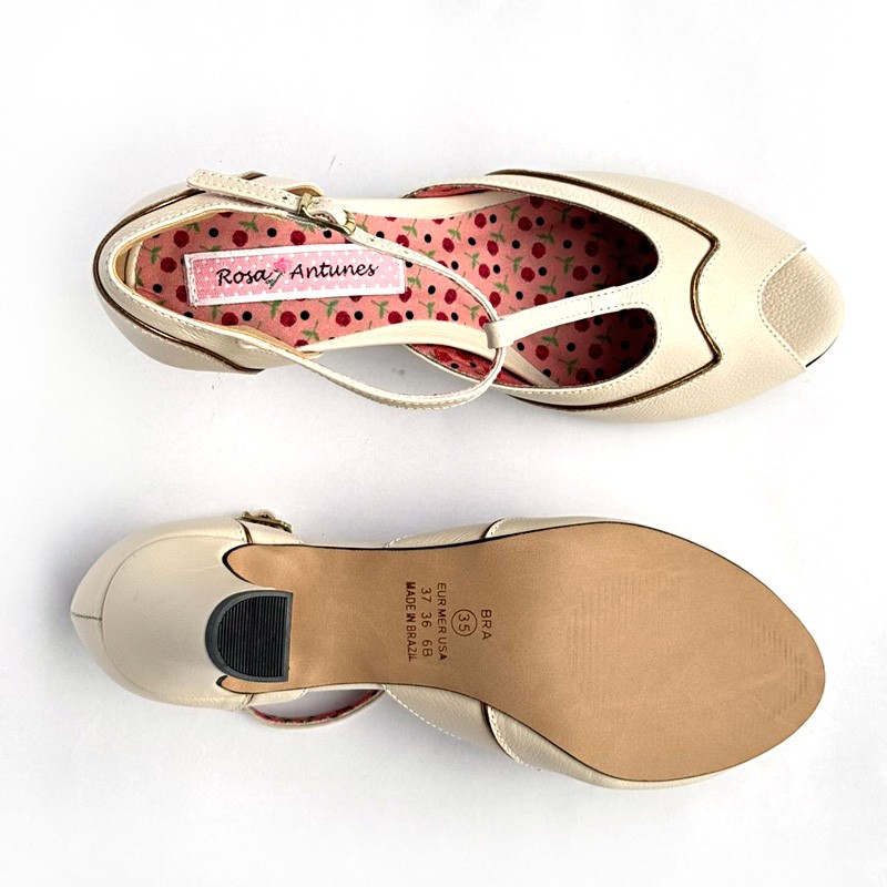 Sandália retrô em couro com salto médio de altura 8,5cm. Feito à mão. Solado em PU Idel para dançar.